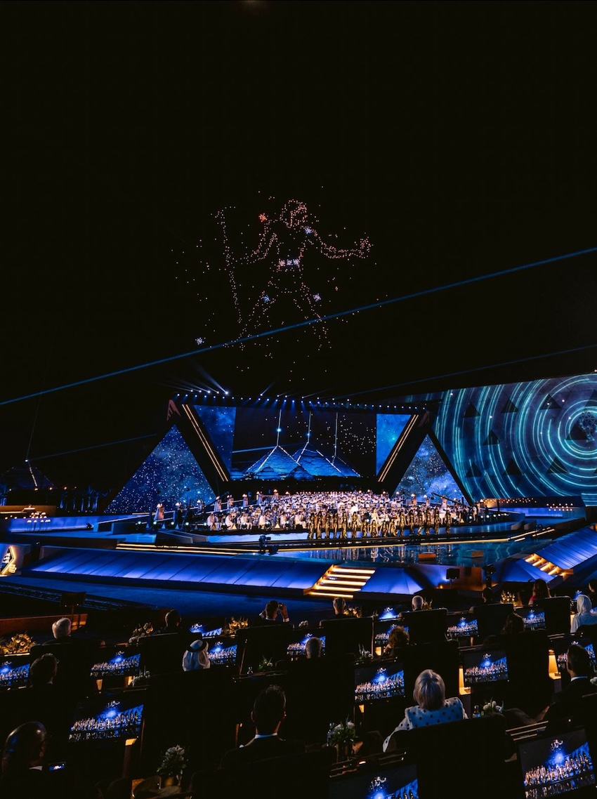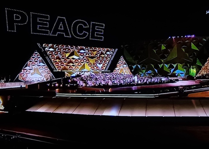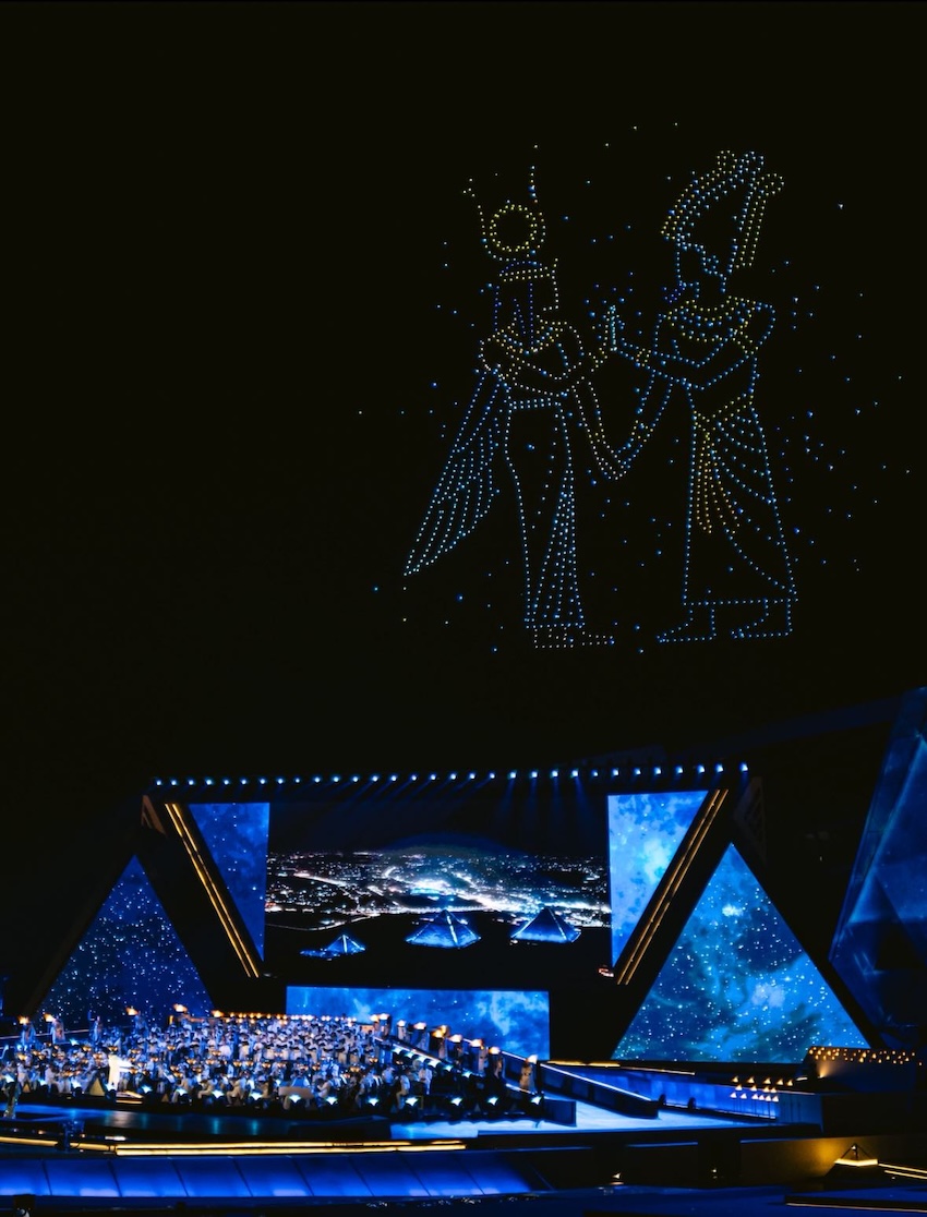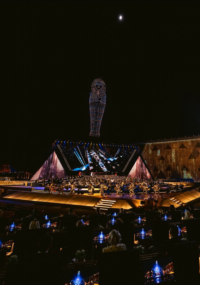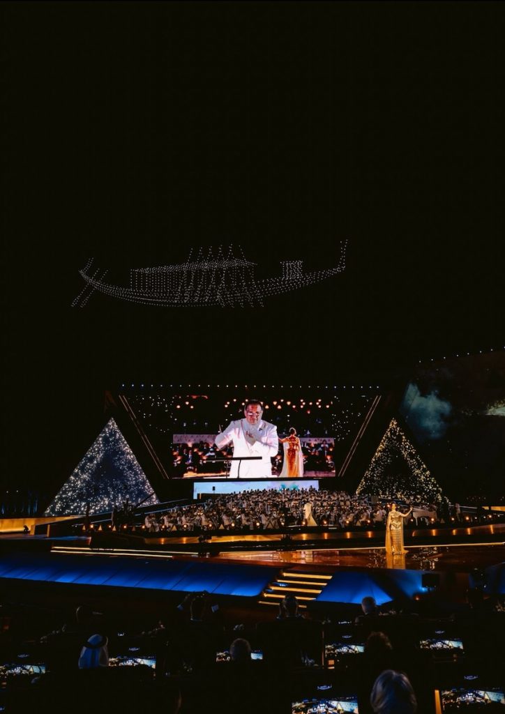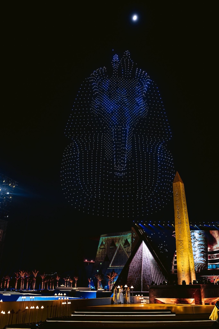 An artistic piece entitled “A Journey of Peace in the Land of Peace” was also presented, highlighting Egyptian creativity in architecture and construction from various periods of history. The show included breathtaking drone displays that traced the shapes of Pharaonic treasures across the sky.