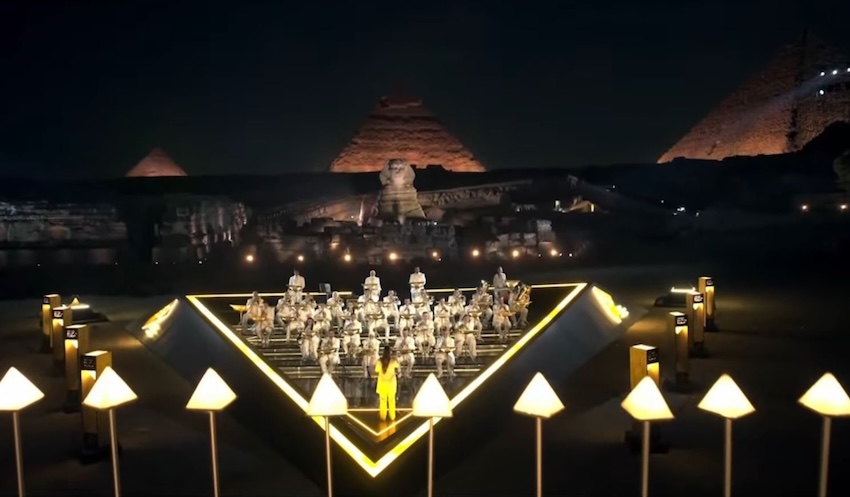 The ceremony featured a spectacular program that blended ancient symbolism with modern artistic performance. Dancers in Pharaonic costumes performed against the majestic backdrop of the pyramids.
