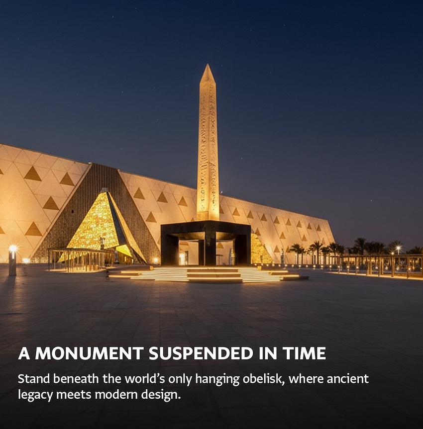 Covering nearly half a million square meters, it houses over 100,000 artefacts, including the complete treasures of King Tutankhamun. It is a masterpiece of architecture and engineering, where stone meets light and desert embraces glass.