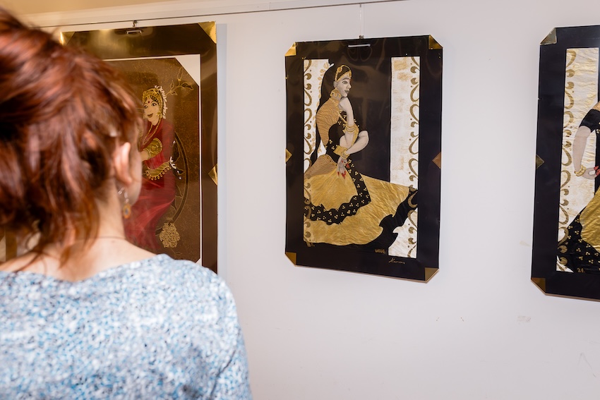 She described her creative process as a meditative act, combining various techniques such as batik, gilding, and layered textures to evoke the luminous essence of this dance tradition.