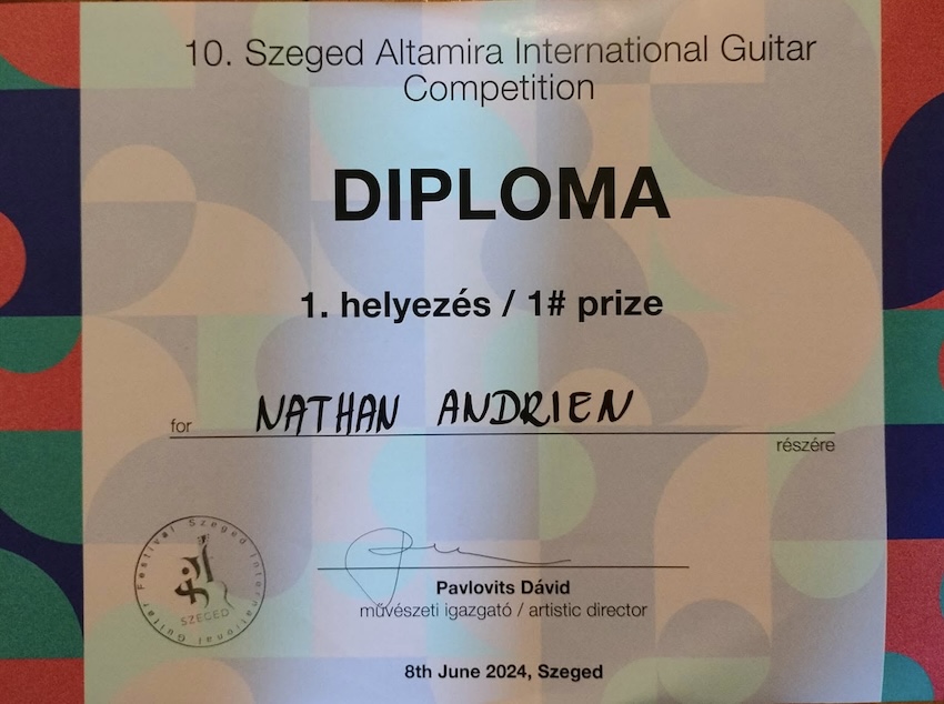 When asked how he envisions his future, Nathan Andrien expressed a dedicated outlook: he aims to pursue an active international concert career while simultaneously engaging in higher music education. Alongside performing, he is deeply committed to teaching, with the goal of transmitting his knowledge, experience, and passion for the guitar – an instrument that has become an integral part of his life.