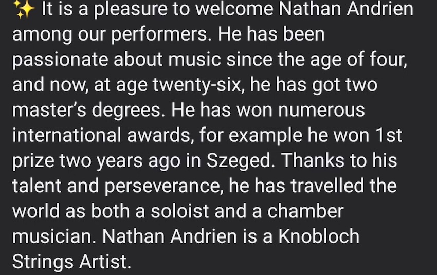 Before the final piece of his program and the encore, Nathan Andrien addressed the audience, expressing his gratitude for their presence and applause, and special thanks to the Ambassador for this opportunity.