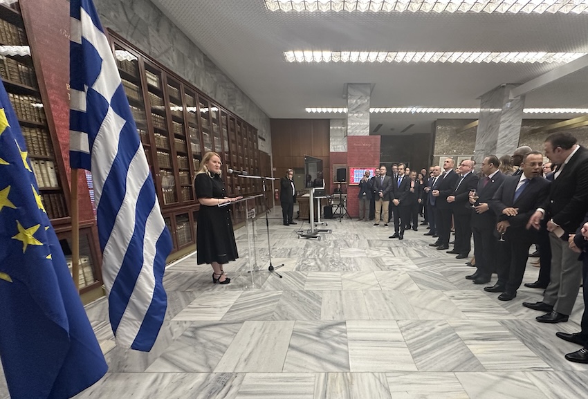 The event opened with the national anthem of Greece, the “Hymn to Freedom”, followed by the anthems of Hungary and the European Union.