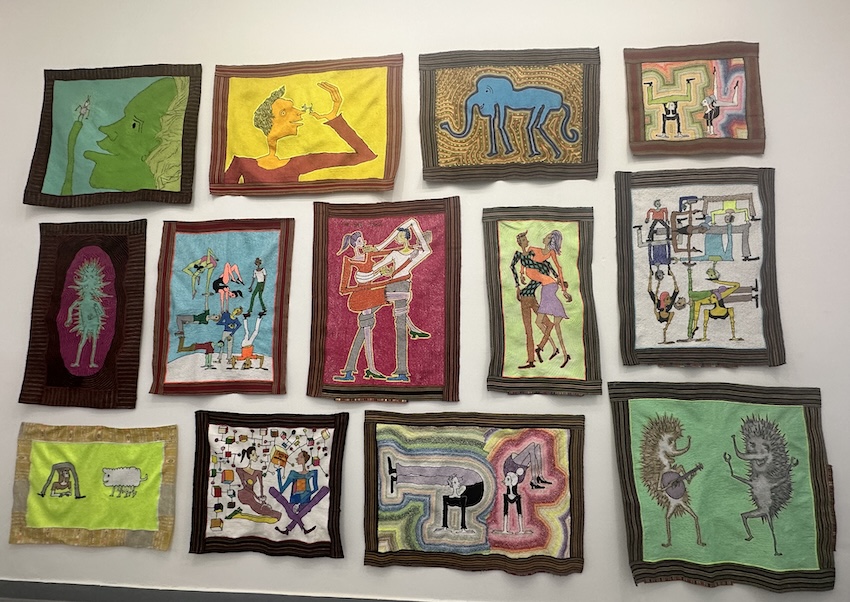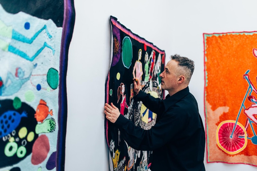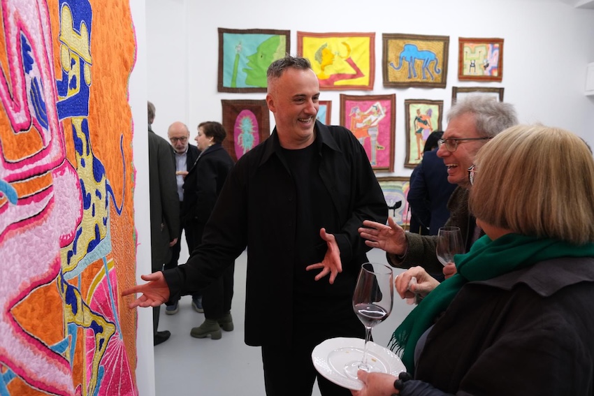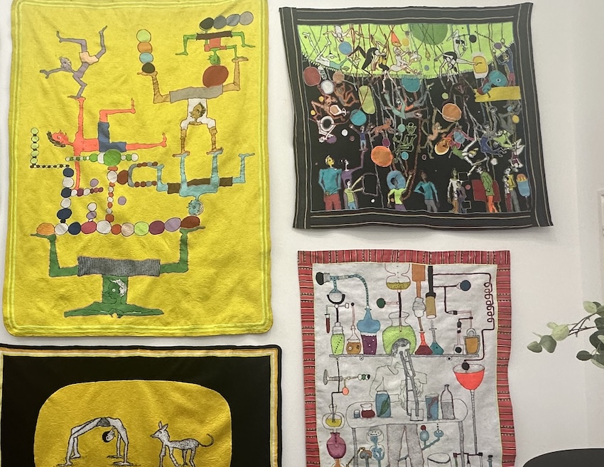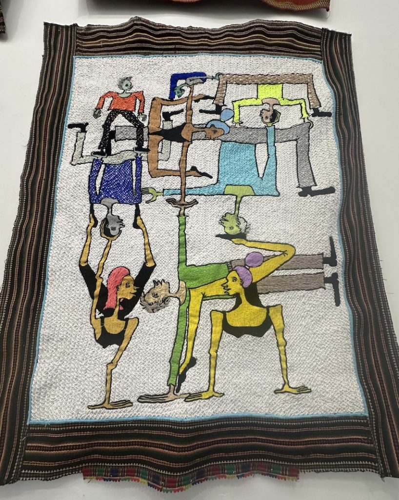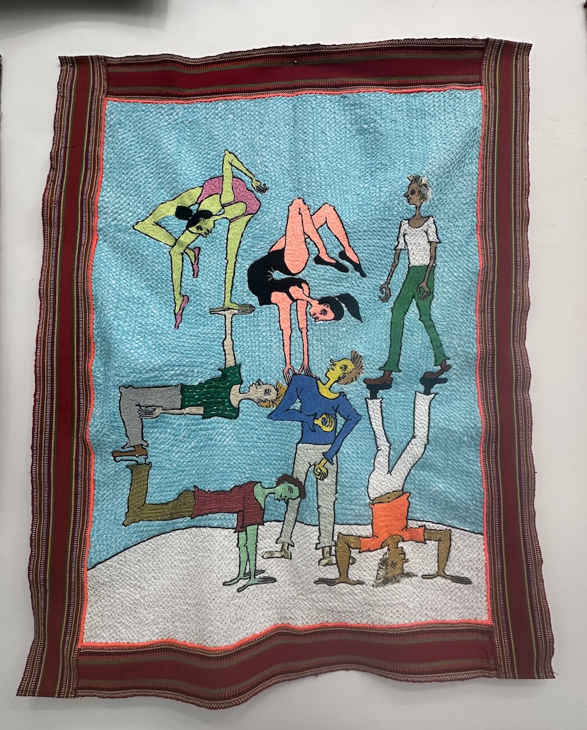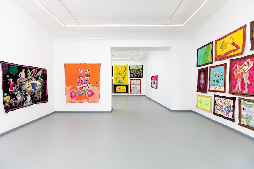 The exhibition also features previously unseen textile works, alongside embroidered pieces from his ongoing We We series, developed since the 2010s, as well as oil paintings.
