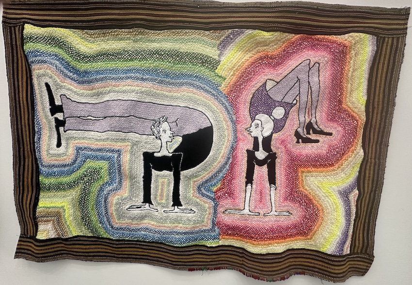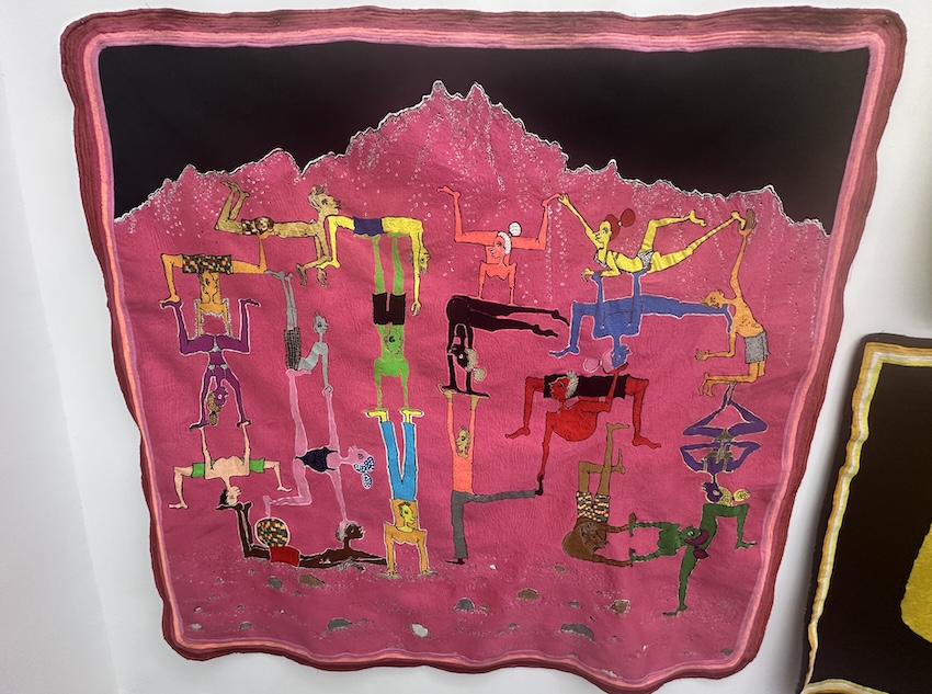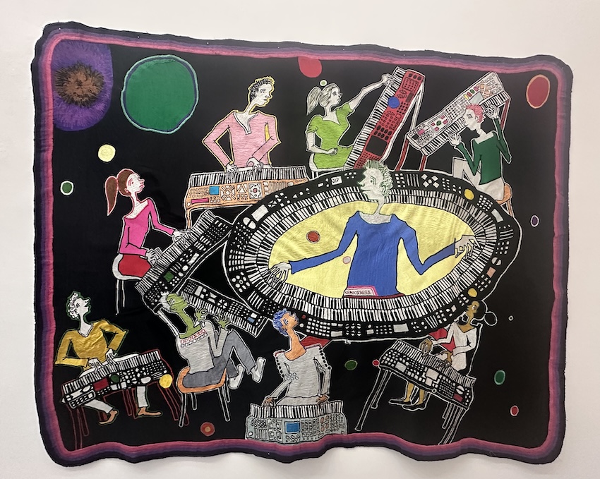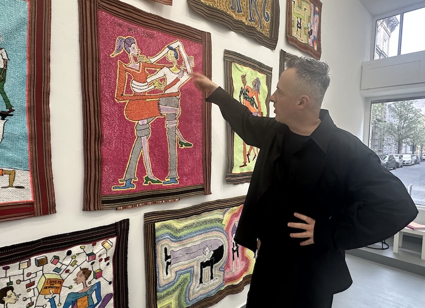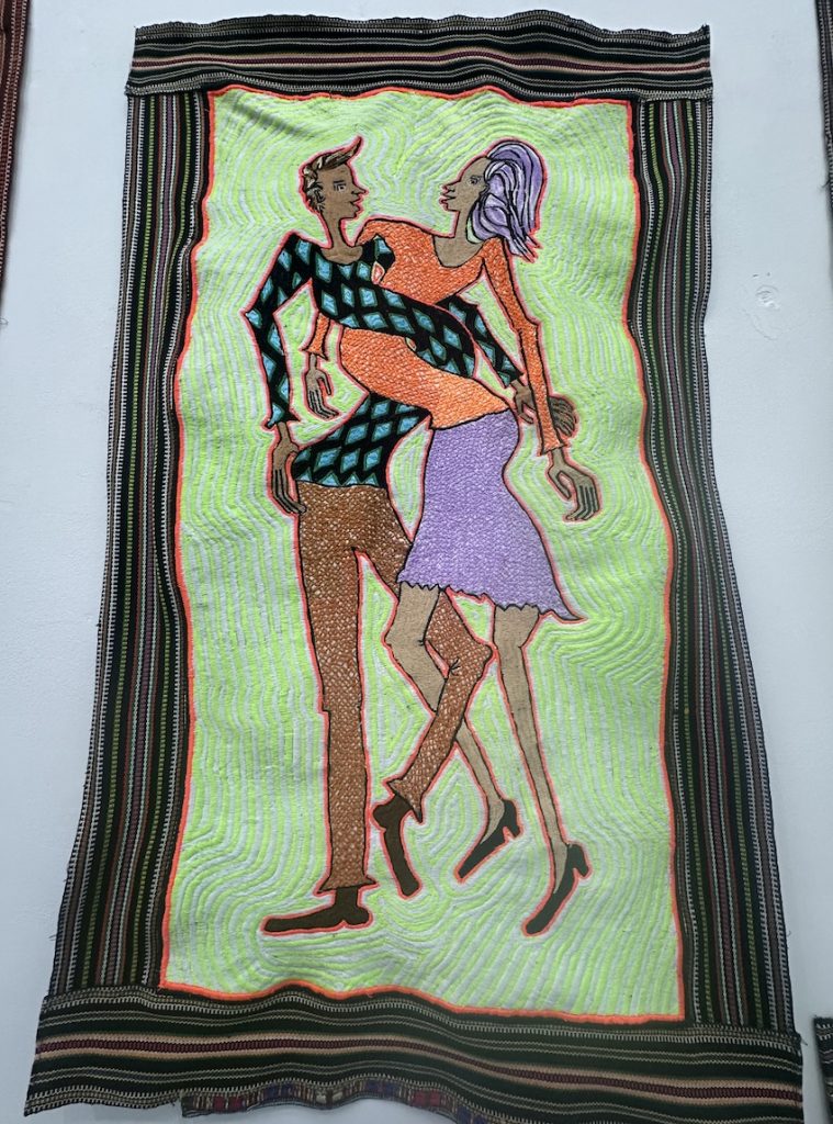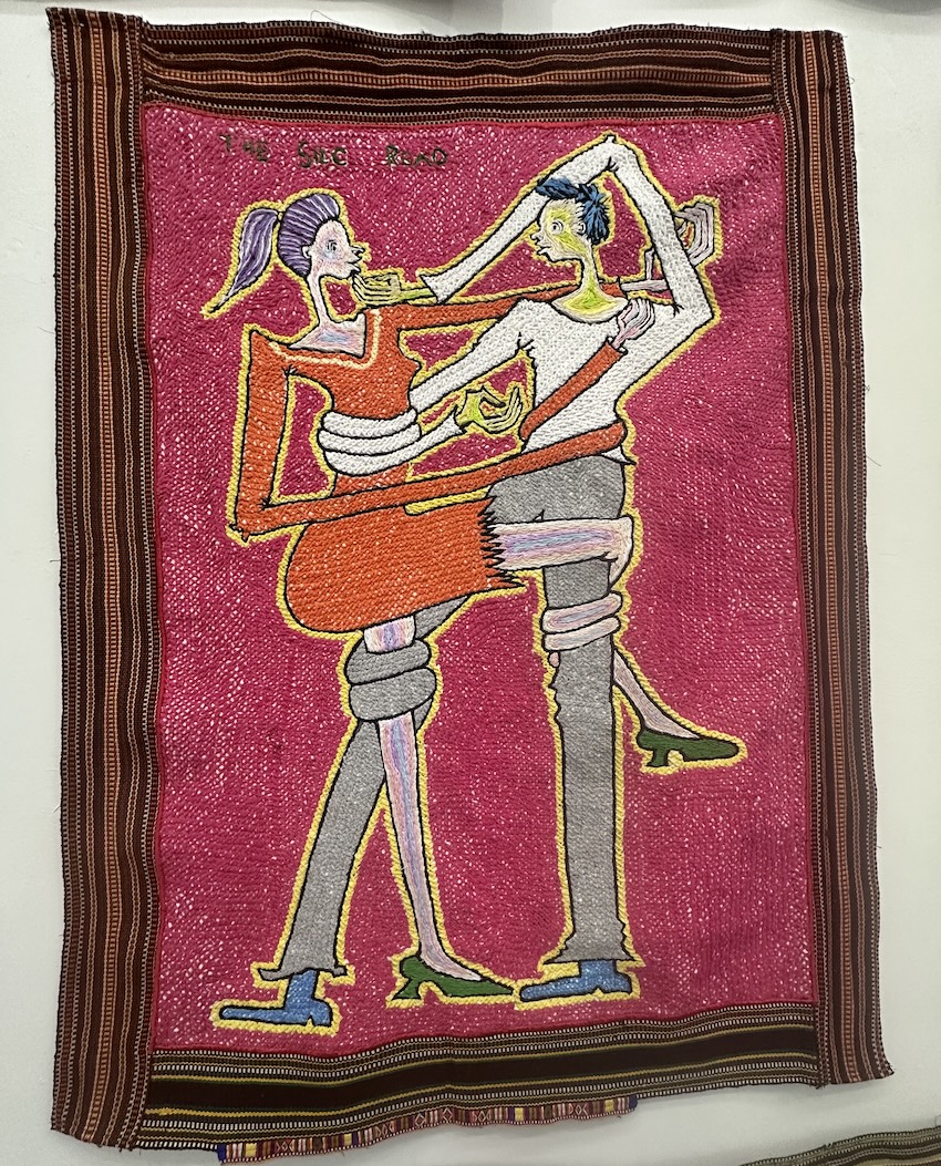 The exhibition also features previously unseen textile works, alongside embroidered pieces from his ongoing We We series, developed since the 2010s, as well as oil paintings.