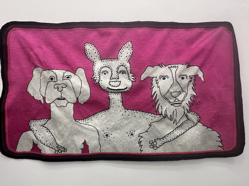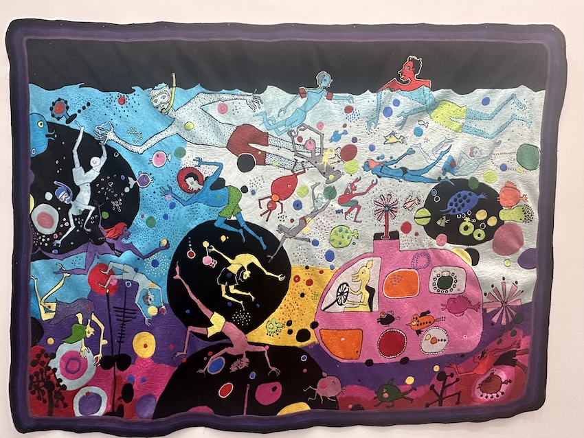 The exhibition offers a comprehensive overview of Ferri’s multifaceted practice, widely recognised for its vibrant paintings and embroideries, in which encounters between everyday people, animals, and hybrid creatures unfold. These presentations often take the form of immersive environmental installations that extend across entire spaces, enveloping the viewer.