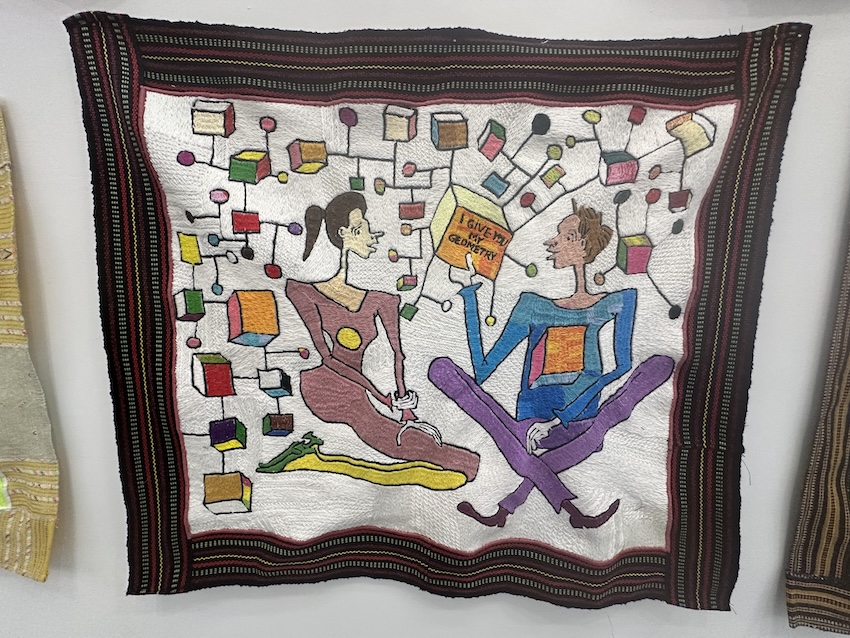 At the 2022 Venice Biennale, The Monumentality of Everyday introduced a new visual approach. The geometric patterns applied to the textiles suggested a kind of digital thinking in image-making, creating a striking contrast with the narrative imagery and evoking parallels with Op Art.