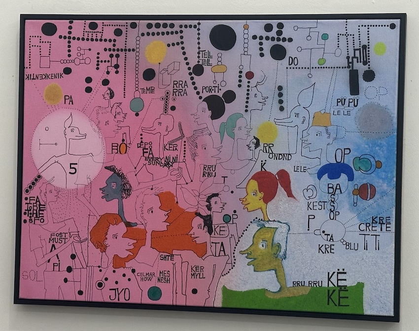 This exhibition is more than an introduction to an artist – it is an invitation to connect. Through his vibrant paintings, textiles, and embroidered works, Jakup Ferri creates a world that is playful yet meaningful, simple yet thought-provoking. His unique style – characterised by flat compositions, imaginative figures, and a blend of childlike wonder and humour – makes his work both accessible and distinctive.