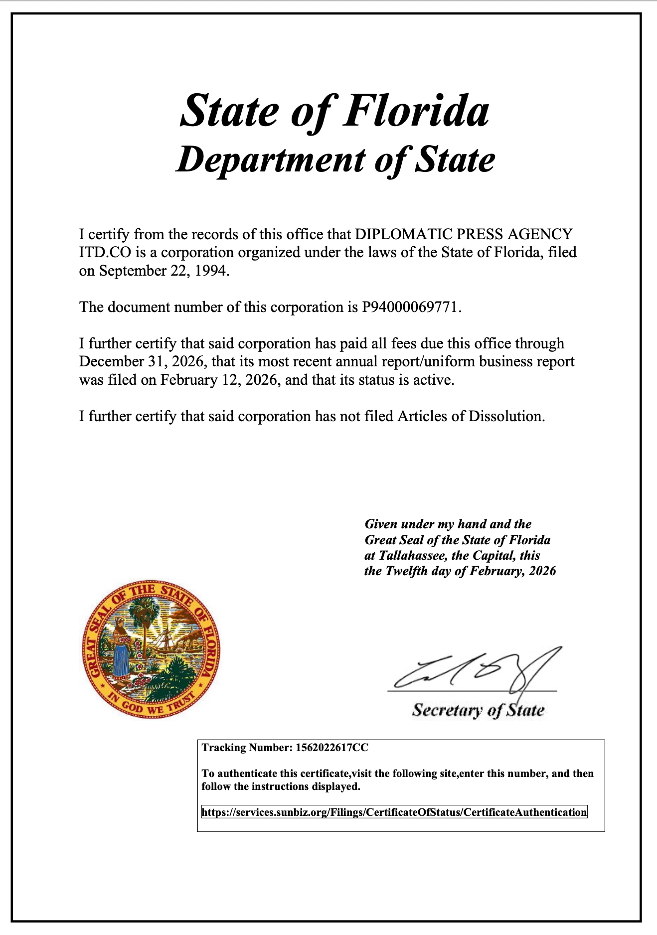 Diplomatic Press Agency Ldt. Co. is registered in Florida/USA