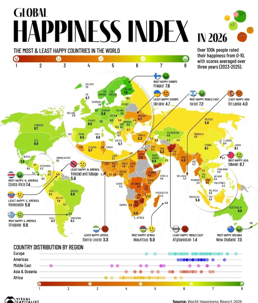 The broader picture concludes with the least happy nations. In the World Happiness Report 2026, Zimbabwe, Malawi, Lebanon and Sierra Leone rank between positions 143rd and 147th, while Afghanistan comes in last. This underscores how closely happiness is tied to stability, security, and social support – and that well-being is not only a personal pursuit but a societal responsibility.